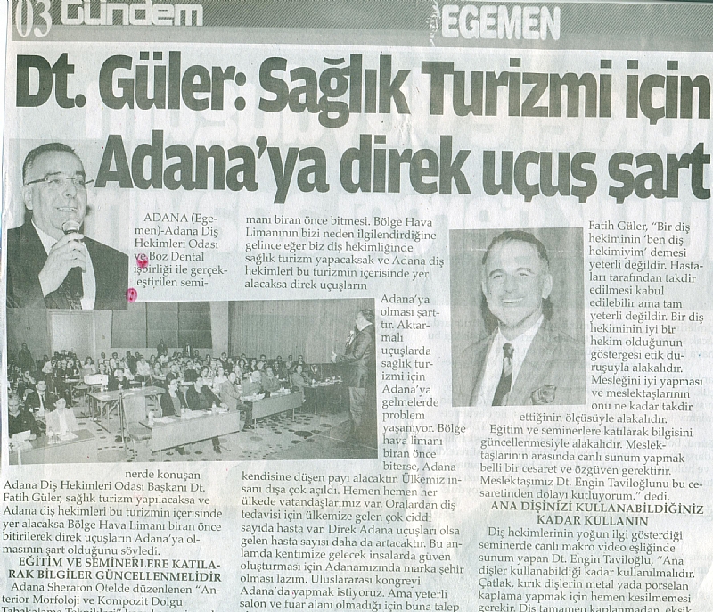 TDB Yönetim Kurulu Üyesi ve Adana Diş Hekimleri Odası Başkanı Dt. Fatih Güler, YK olarak ‘Konvansiyonelden Dijitale Restorasyonlar’, ‘Endokron/Lamine&Materyalleri’ konu başlığıyla düzenledikleri bilimsel toplantı da “Sürekli kendini yenileyen diş hekimliği giderek dijitalleşiyor, dijitalleşme ile birlikte hasta memnuniyeti artıyor.” dedi.